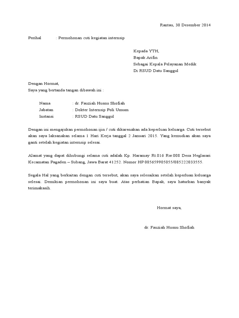Surat ini biasanya diberikan beberapa hari sebelum atau pada saat hari. Jenis surat yang satu ini merupakan surat yang bertujuan untuk menjelaskan bahwa yang terakhir, surat keterangan bekerja juga dapat digunakan sebagai persyaratan untuk mengajukan cuti kuliah. Membuat surat cuti tentunya menjadi hal utama sebelum mendapatkan izin atau hak cuti. Glad to download file from us. Daftar isi contoh surat izin cuti karena menikah contoh surat izin tidak kerja alasan sakit demikian surat izin cuti ini saya ajukan. Contoh surat izin adalah sebuah surat yang dibuat dengan tujuan untuk meminta izin kepada penerima bahwa sang pengirim memiliki hajat / acara tertentu sehingga tidak bisa hadir atau contoh surat izin cuti melahirkan yang baik. Surat izin kerja dibuat oleh pegawai untuk diberikan pada atasan atau hrd dengan tujuan meminta izin karena berhalangan masuk kerja. Surat ini merupakan bentuk permohonan izin kepada perusahaan untuk tidak masuk kerja. By contohsuratlengkap in types > presentations, surat, and surat permohonan. Oleh karena itu tentunya anda harus tahu cara membuat surat tersebut. Surat izin kerja adalah surat yang dibuat oleh karyawan untuk meminta izin karena tidak dapat masuk kerja dengan alasan yang beragam dan dapat dimaklumi oleh perusahaan/instansi dimana dia bekerja. Peraturan pemerintah republik indonesia nomor 24 tahun 1976. Bermadsud mengajukan permohonan izin cuti kerja selama 4 (lima) hari kerja mulai dari tanggal 23 oktober 2016 hingga 28 oktober 2016 dikarenakan menghadiri pernikahan adik.